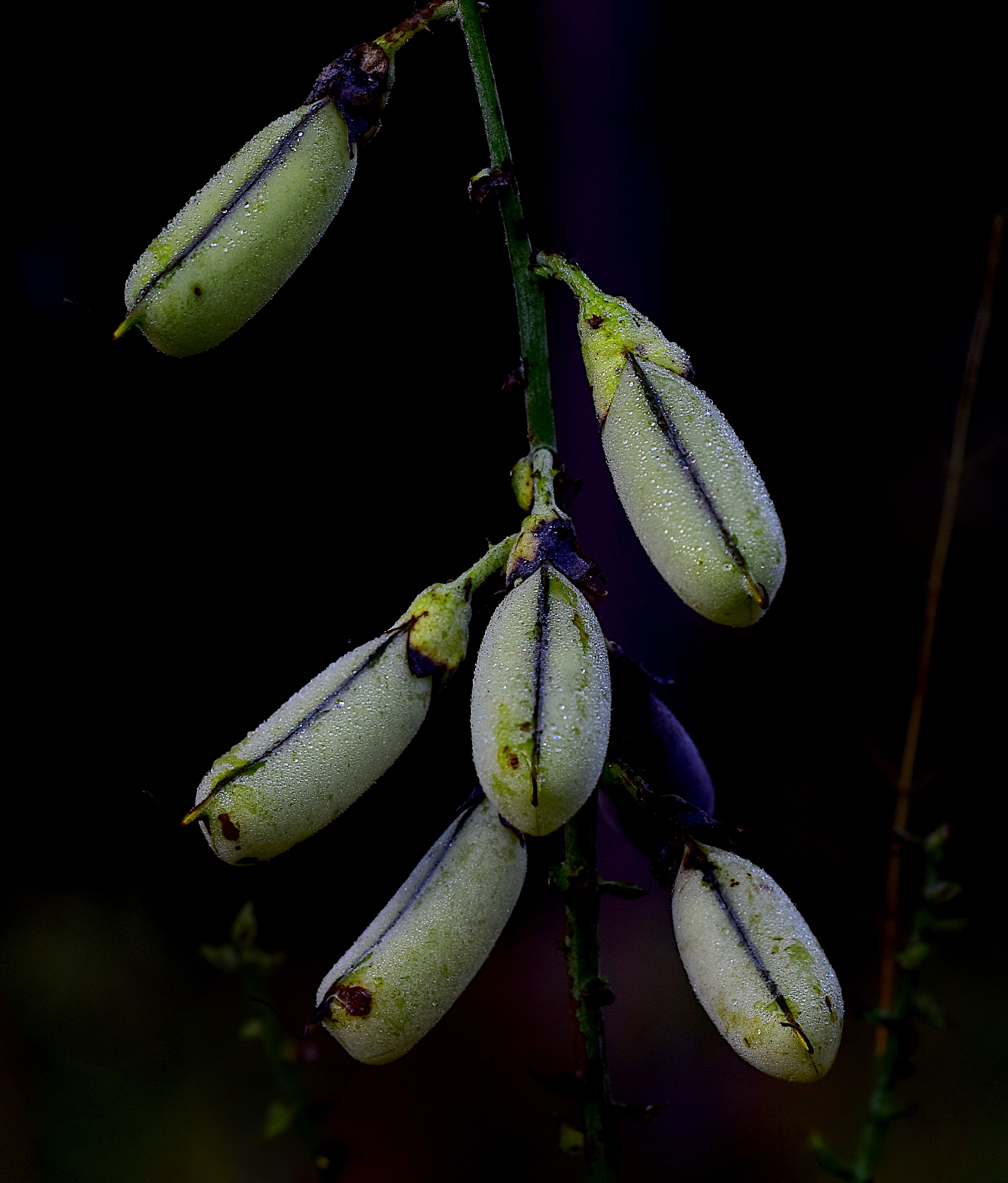 C. spectabilis seed pods. 4 cm long. The pods of C. pumila look similar but are smaller. Crotalaria, and especially their seeds, are laden with toxic alkaloids. Larvae of the rattlebox moth, Utetheisa ornatrix, bore through the walls of the pods and feed on the seeds. Somehow the caterpillars manage to detoxify the alkaloids enough so they aren’t poisoned, while remaining poisonous enough to deter most animals that might try to eat them. The larvae retain the toxins into the flying-moth stage, and at both stages their distinctive vivid color pattern warns predators to leave them alone.