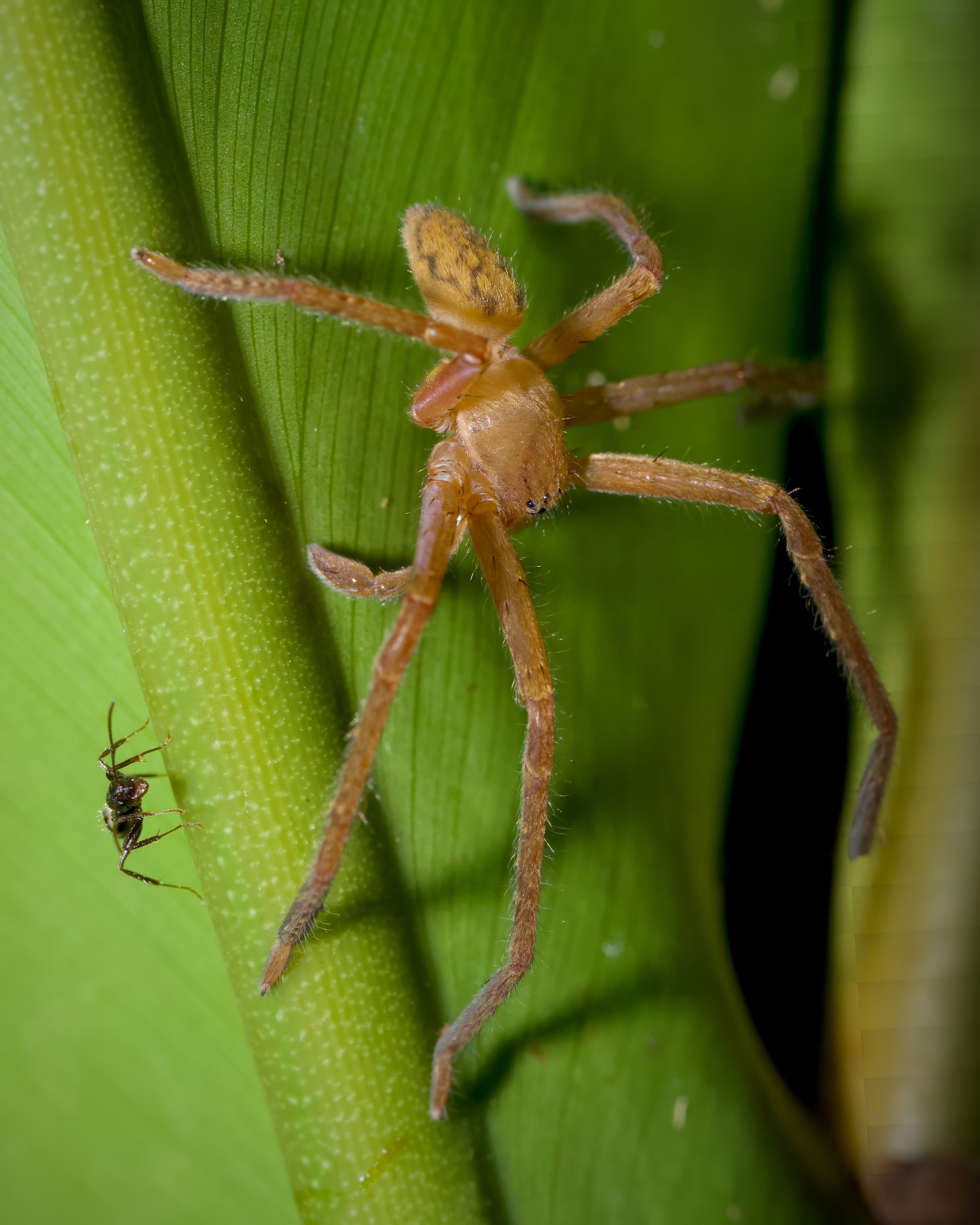 The genus Meri belongs to the family Sparassidae, the huntsman spiders. Huntsman spiders are characterized by their laterally extending, crab-like legs, rapid movement, and hunting lifestyle. They do not build webs. Instead, they actively pursue and overpower prey, relying on speed and ambush tactics. Sparassids are among the fastest-running spiders. Though their venom can cause local swelling, pain, or nausea in humans, huntsman bites are rarely medically significant. This handsome individual is perhaps Meri trinitatis: