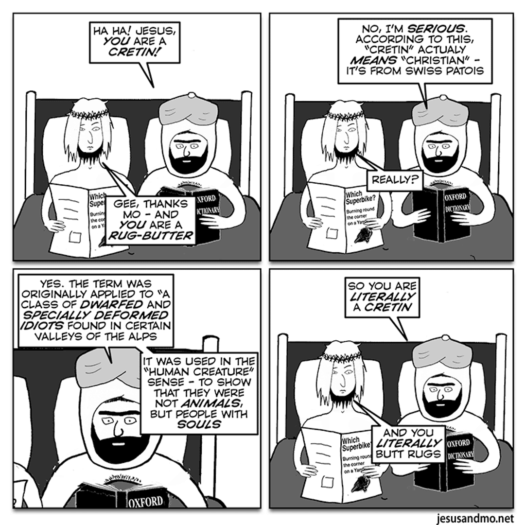 As for “rug-butter,” I couldn’t find it but assume it is a derogatory reference to Muslims worshiping on prayer rugs, touching their heads to the ground. But no, Jessus is not literally a cretin as he’s neither deformed nor hails from the Swiss Alps. But I guess Mo literally butts rugs, though I’ve never seen him kneeling in prayer.