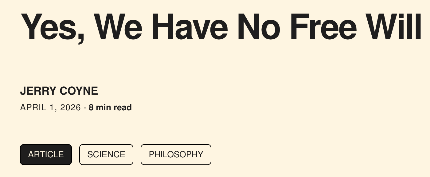 Coyne is unhappy with my invoking of “emergence” and says I’m being rude to him and Sapolsky and Harris in accusing them of “physics envy,” but that’s what it is! Here, for example, is Sapolsky defending his belief that free will does not exist because single neurons don’t have it: “Individual neurons don’t become causeless causes that defy gravity and help generate free will just because they’re interacting with lots of other neurons.”
