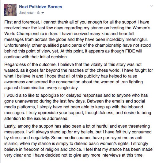 Here was Nazi Paikidze’s comment today on Twitter. A thoughtful summation of what I think quickly became something much larger than anyone anticipated: https://pbs.twimg.com/media/CtvWpR9VUAAjfcJ.jpg:large