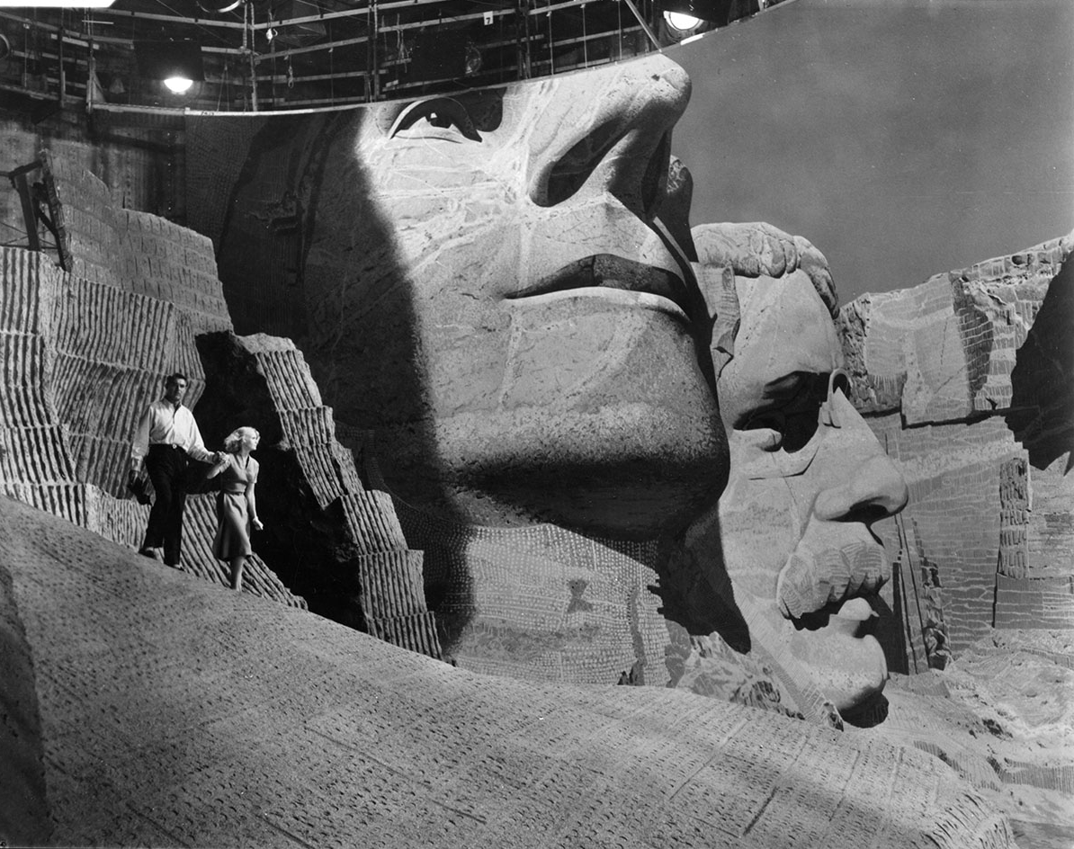 The reconstruction of Mount Rushmore is Hitchcock’s “North by Northwest” is actually 25% actual size though in a few places rear projection photography is used. Roosevelt’s head is much less far back on the set than on the real Mt. Rushmore.