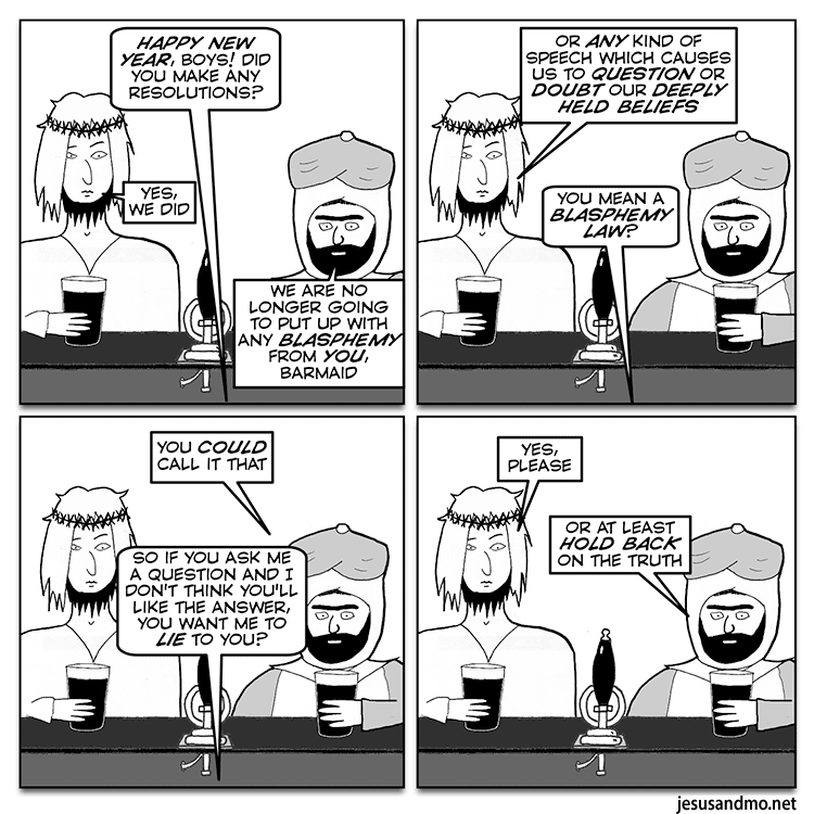 Today’s Jesus and Mo strip, called “please,” rings in the new year, with Mo asking for a distinction that’s not a difference. And no, they’ll have to put up with blasphemy, though you might get executed for blaspheming Islam in countries that adhere to that faith. Blasphemy mesaures are still on the books in Western countries like Spain and Northern Ireland, but they’re never enforced.