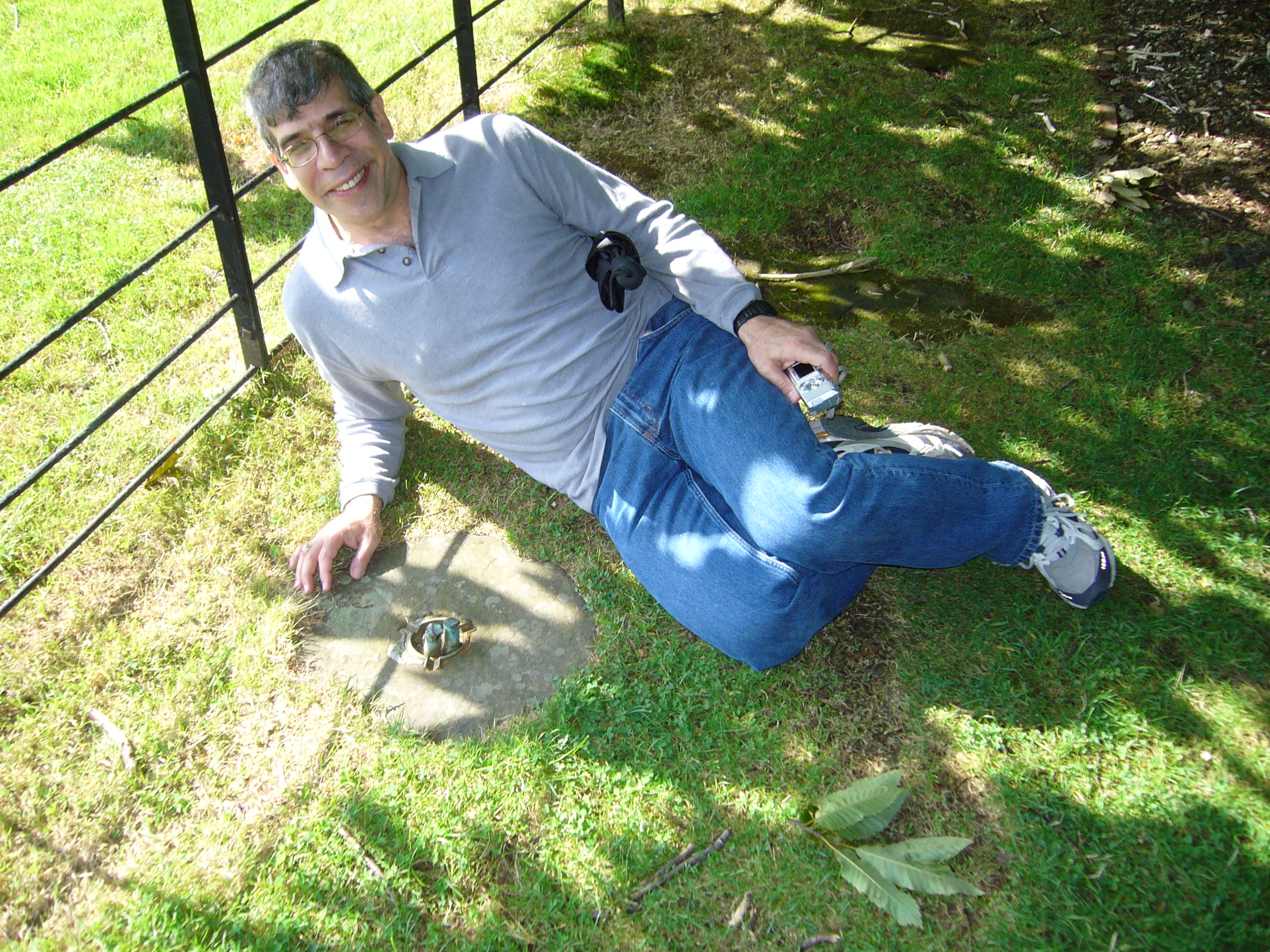 From Jerry: Here I am in 2006 at Down House, Darwin’s residence, next to a replica of the “wormstone”, whose subsidence over time was used by Darwin to measure the “slow burial of chunks of marble” due to earthworm activity: