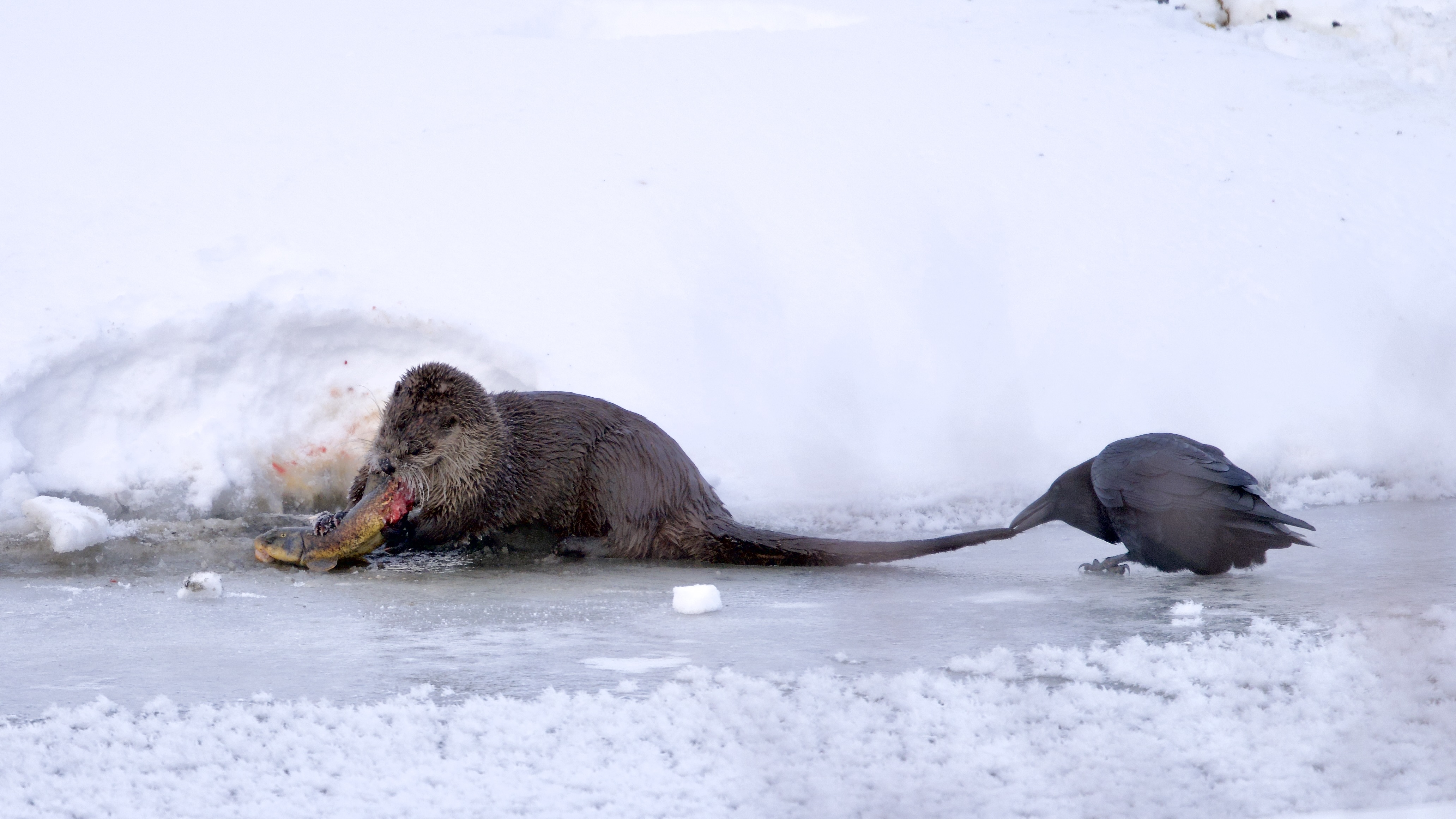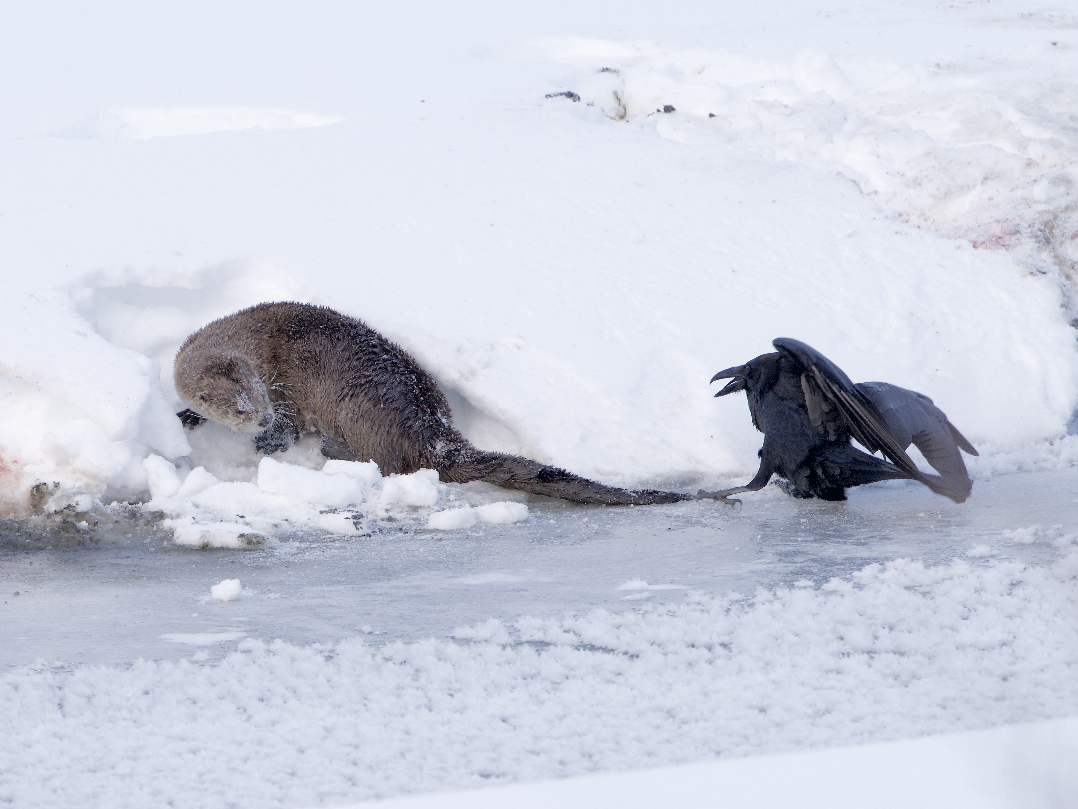 While river otters primarily eat fish, they will happily eat a bird when the opportunity arises. I have watched them hunt ducks and even pelicans. Hence this raven was quite bold to be pecking at the otter’s tail. After several minutes of this the otter had had enough. He threw the remains of his sucker fish back into the ice hole and turn to face his attacker. The raven immediately backed off and flew away: