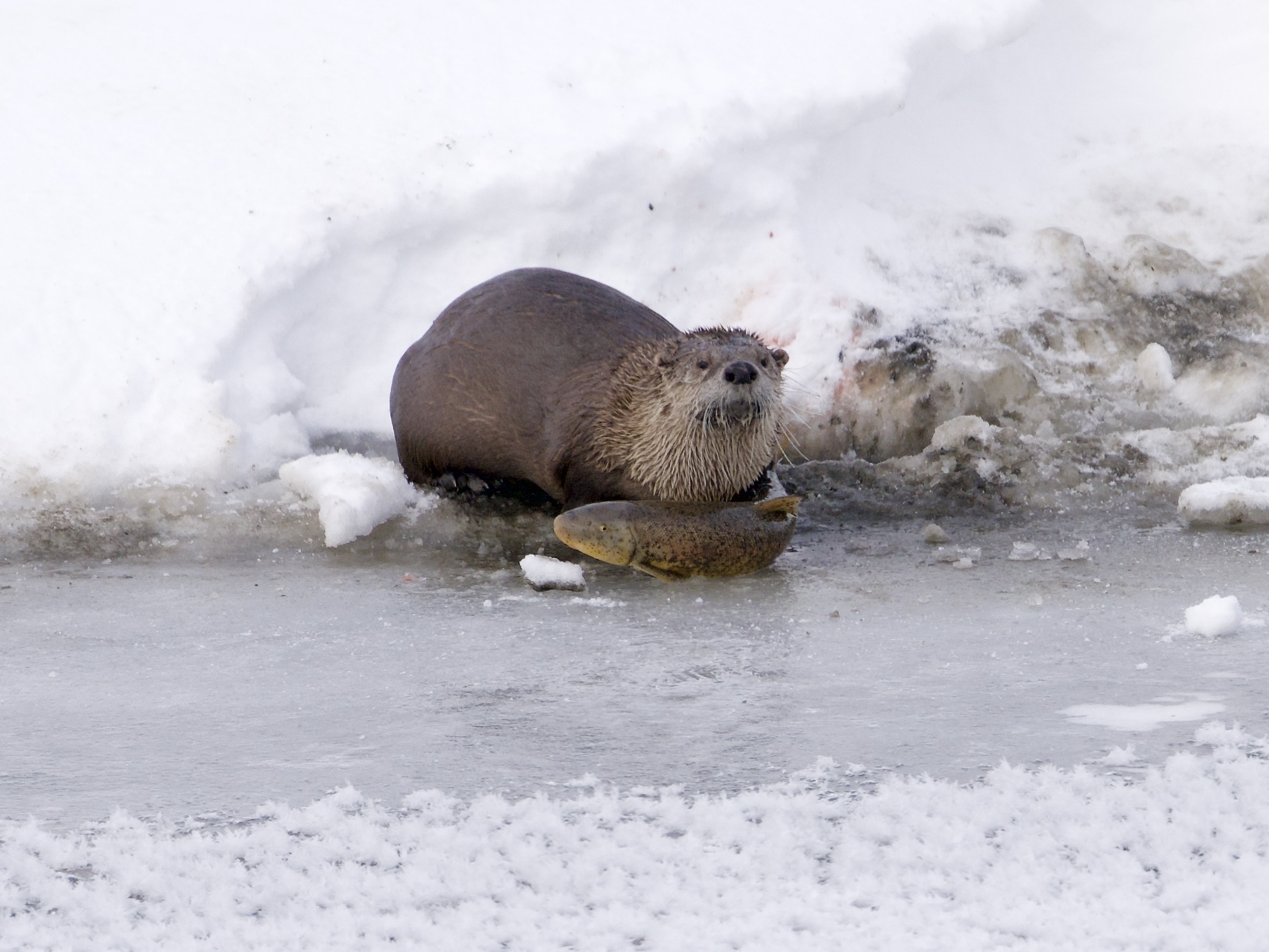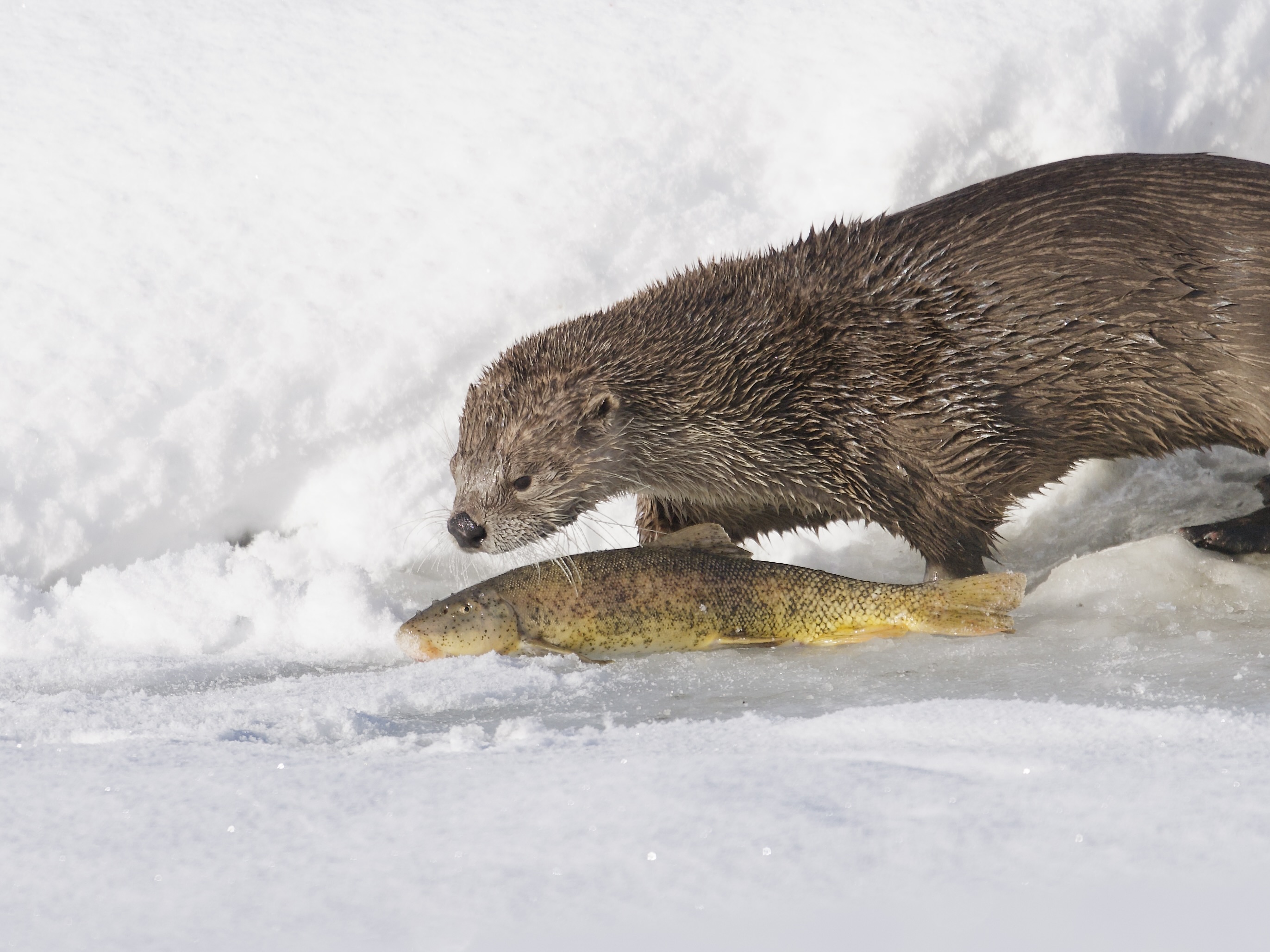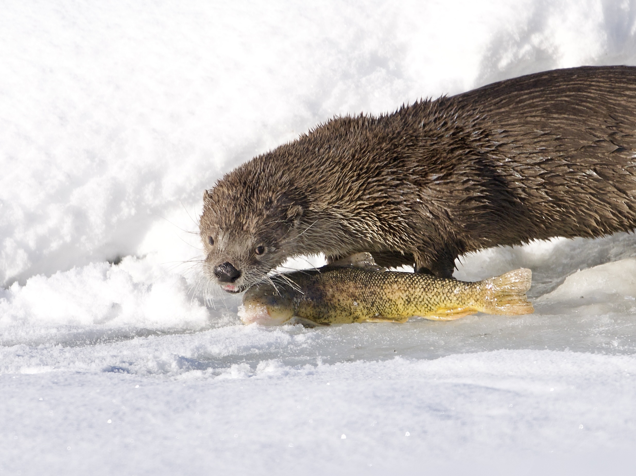 After eating a large Utah sucker fish, the river otter dove back into his ice hole and emerged with another, which he also quickly consumed. He must burn a lot of calories!: