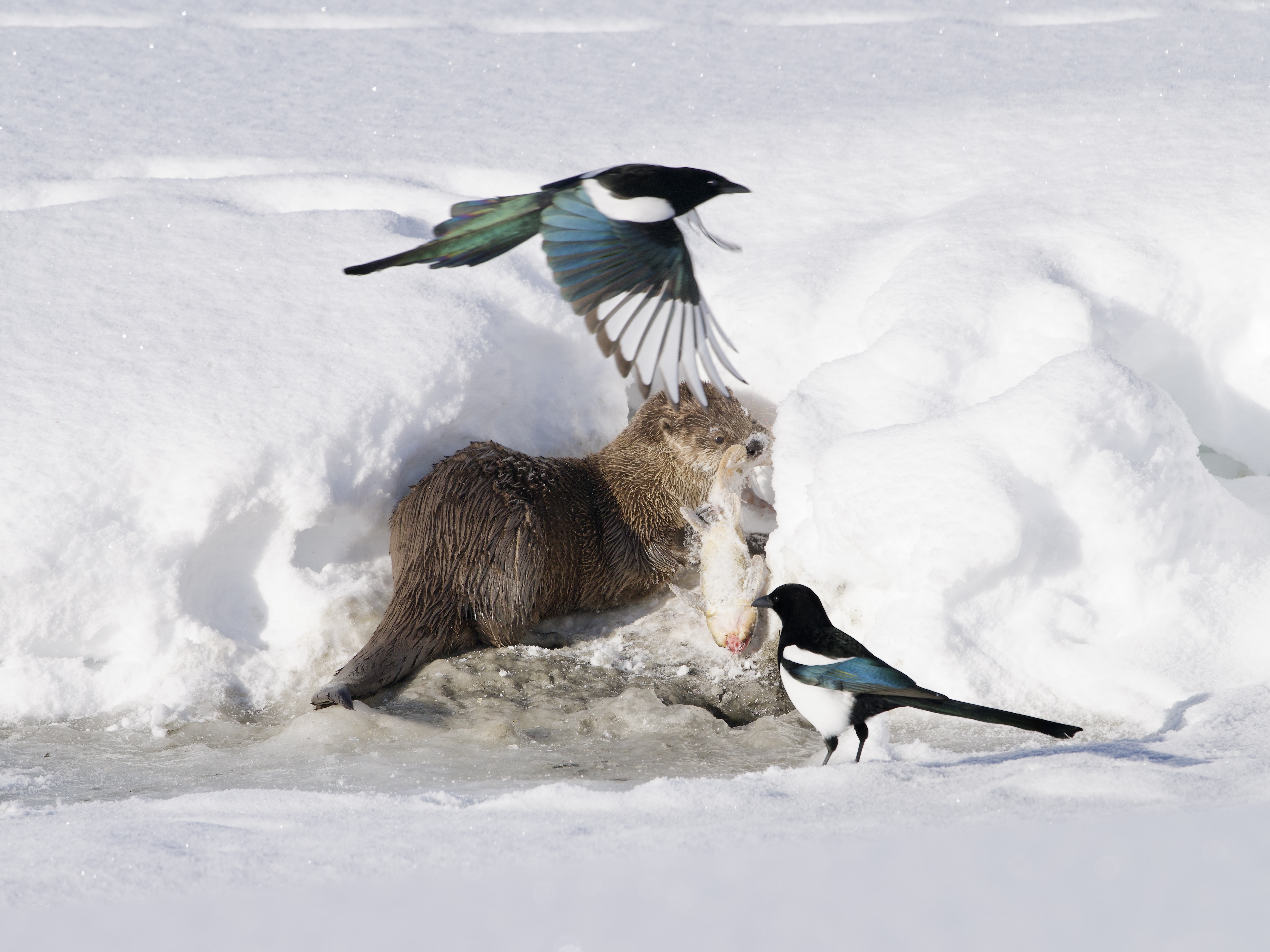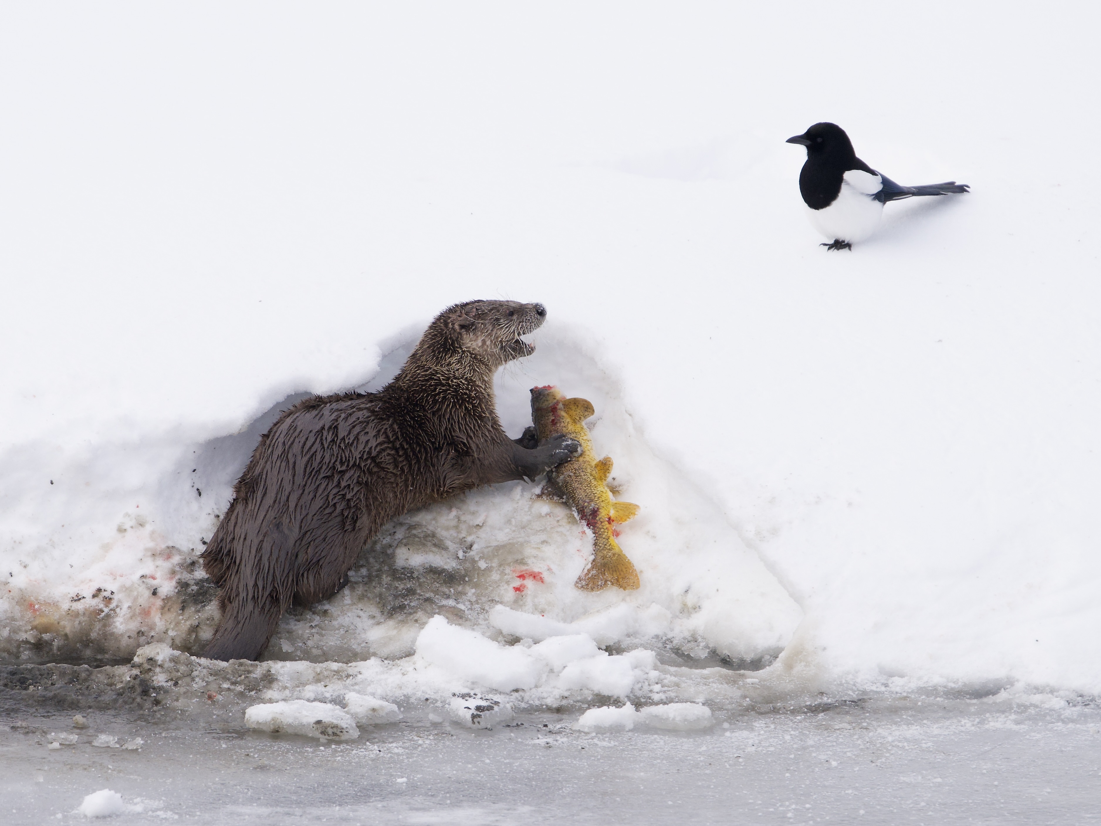 The river otter extolling the virtues of Utah sucker fish to a Black-billed magpie (Pica hudsonia):