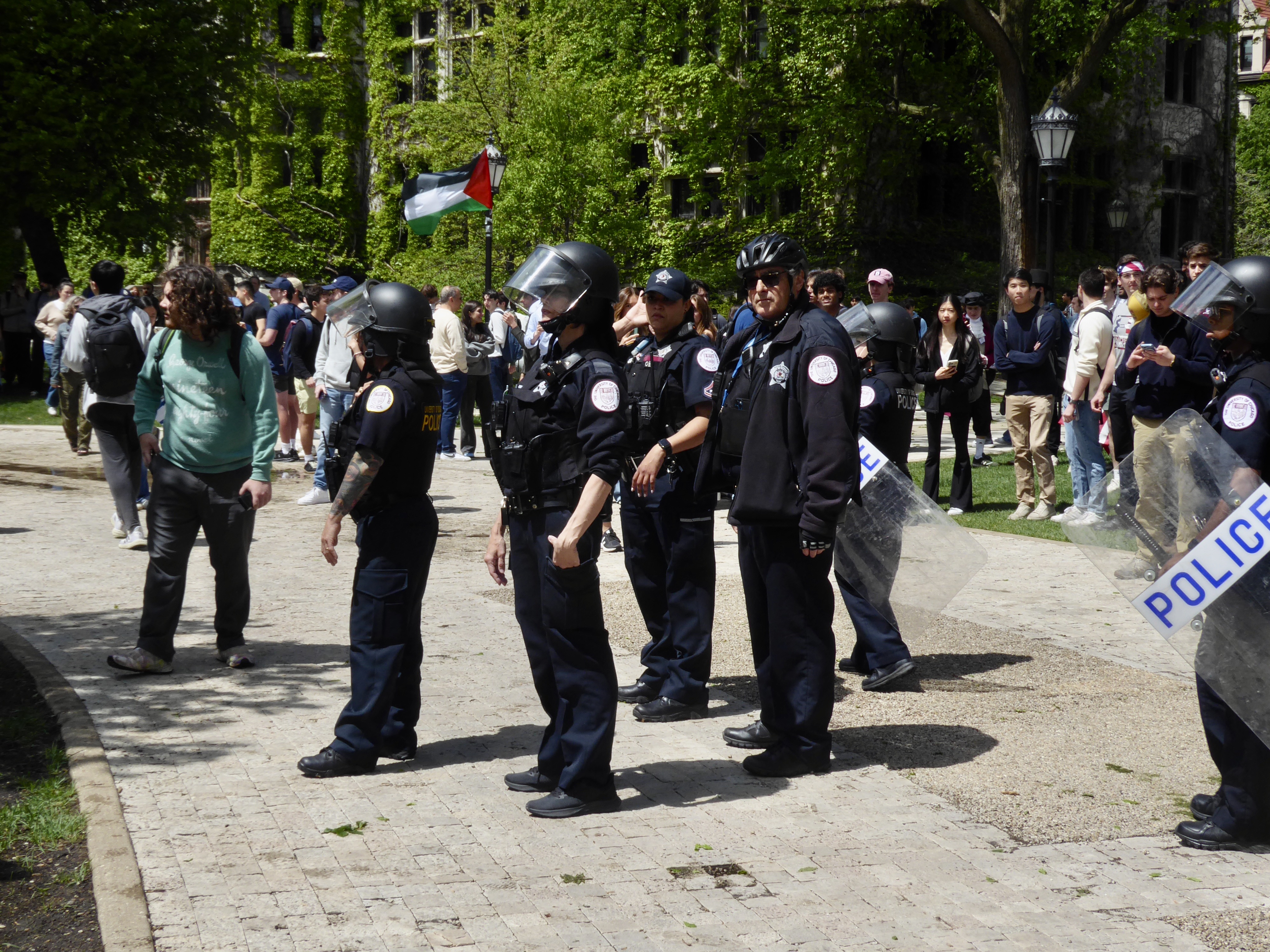 And the University Police facing in both directions: towards the encampment and towards the people with American flags. There’s a view of the chanting protestors, with some linking arms around the encampment to prevent anybody getting in.