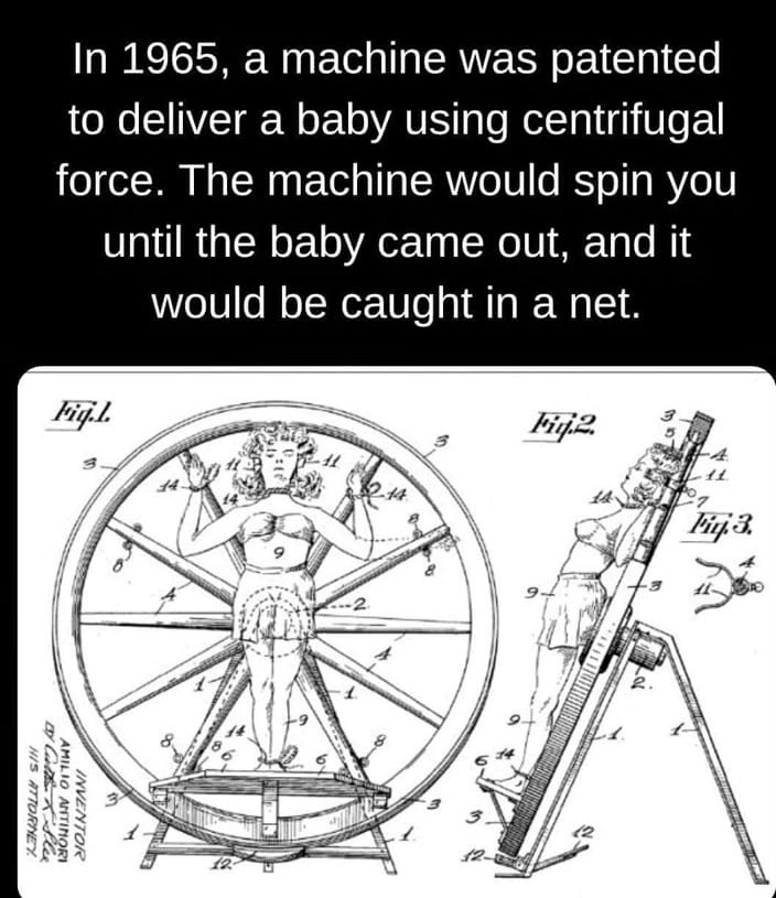 The patent for the centrifugal baby delivery system is real – it’s US Patent 3216423. The Science Gallery of Trinity University (Dublin) built one for their “Fail Better” exhibition in 2014, which I where I saw it.