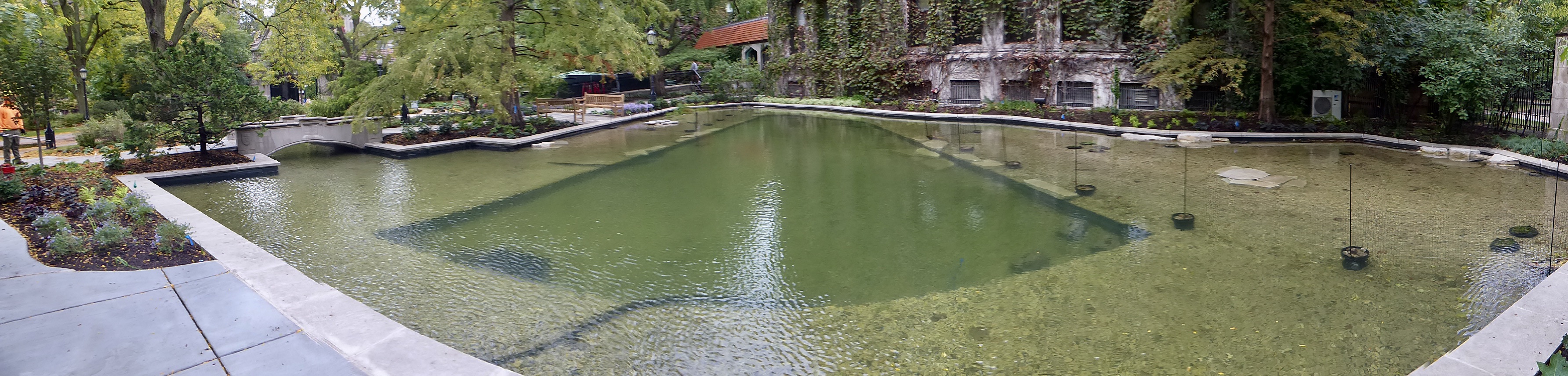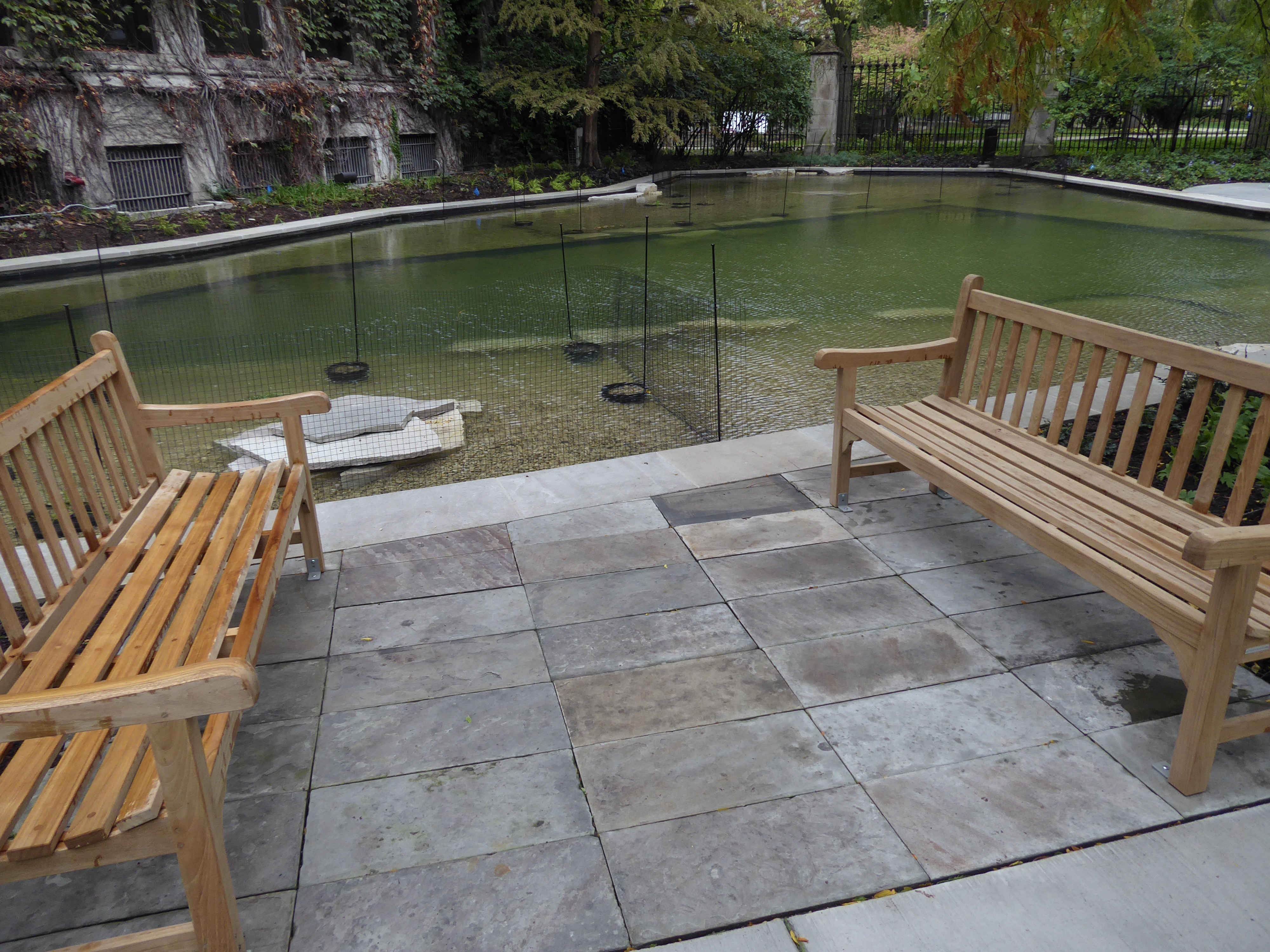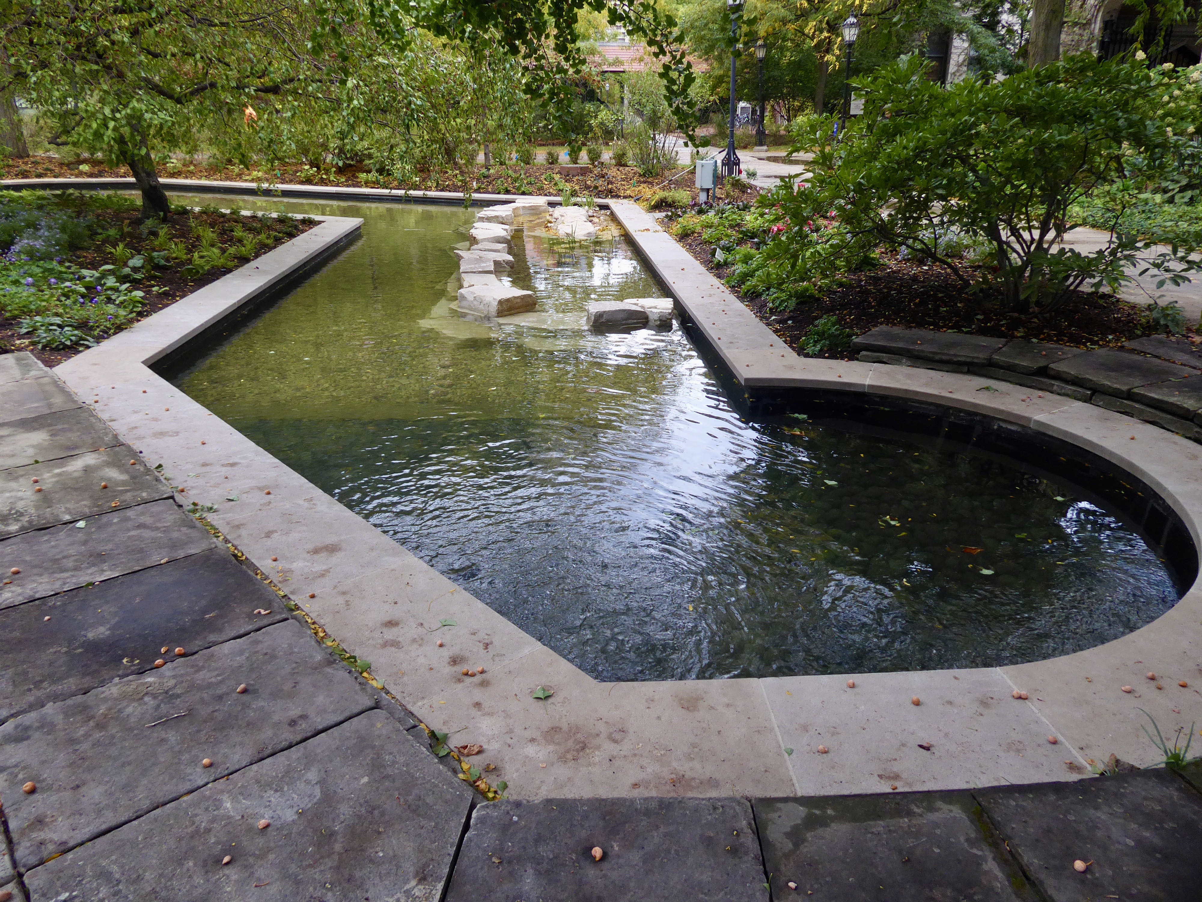 There are large pebbles (or small rocks) in the shallow part, and then a geometrical design of levels. The pond gets deeper (but still below my chest) in the center. Note, at upper right, that the cement bench is still there, along with some tables and chairs that have been put on the cement patio. The building to the left is Erman Hall, on whose windowsills the mallards nest.