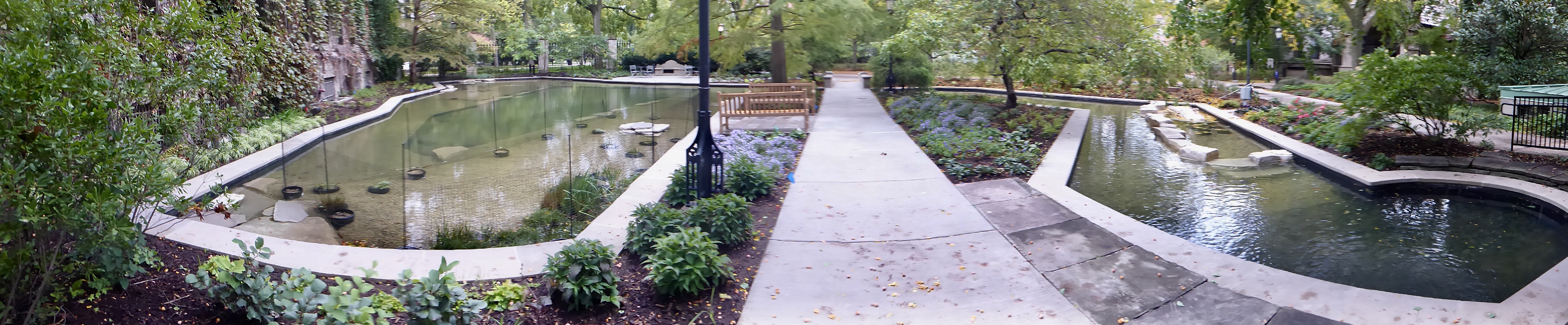 The channel, which contains the filtration system (no new water is piped in as in days of yore; rather, the water is filtered and recirculated). The water bill for the old pond was exorbitant, and there were constant leaks, which have been fixed. The end of the channel is designed as a “reflecting pool,” though it’s hard to see what’s reflected. The boulders in the pond are designed to entrap debris which is removed by the filtration system: