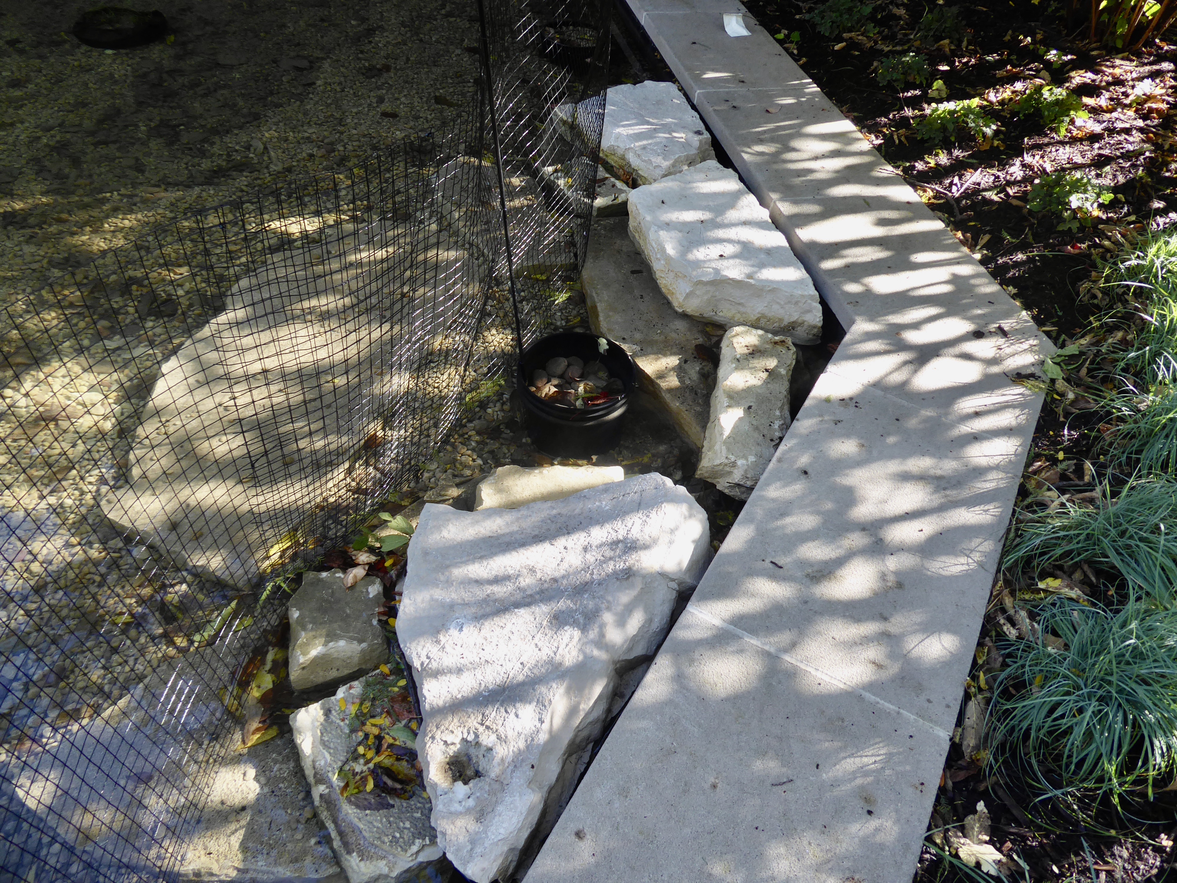 Where the ducklings will climb out. I hope the stones are low enough to allow an easy exit (the fence will be gone by next spring):