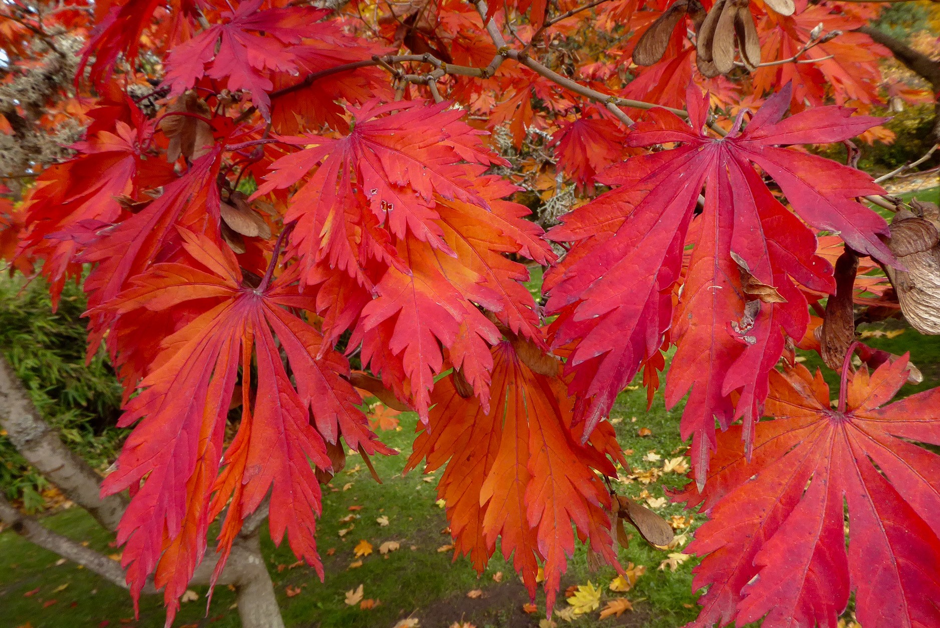 The red foliage is various ornamental maples (Acer), the large yellow leaves belong to the native bigleaf maple (Acer macrophylla), the tall conifers are coast redwoods (Sequoia sempervirens), and there’s a late-blooming azalea (Rhododendron):