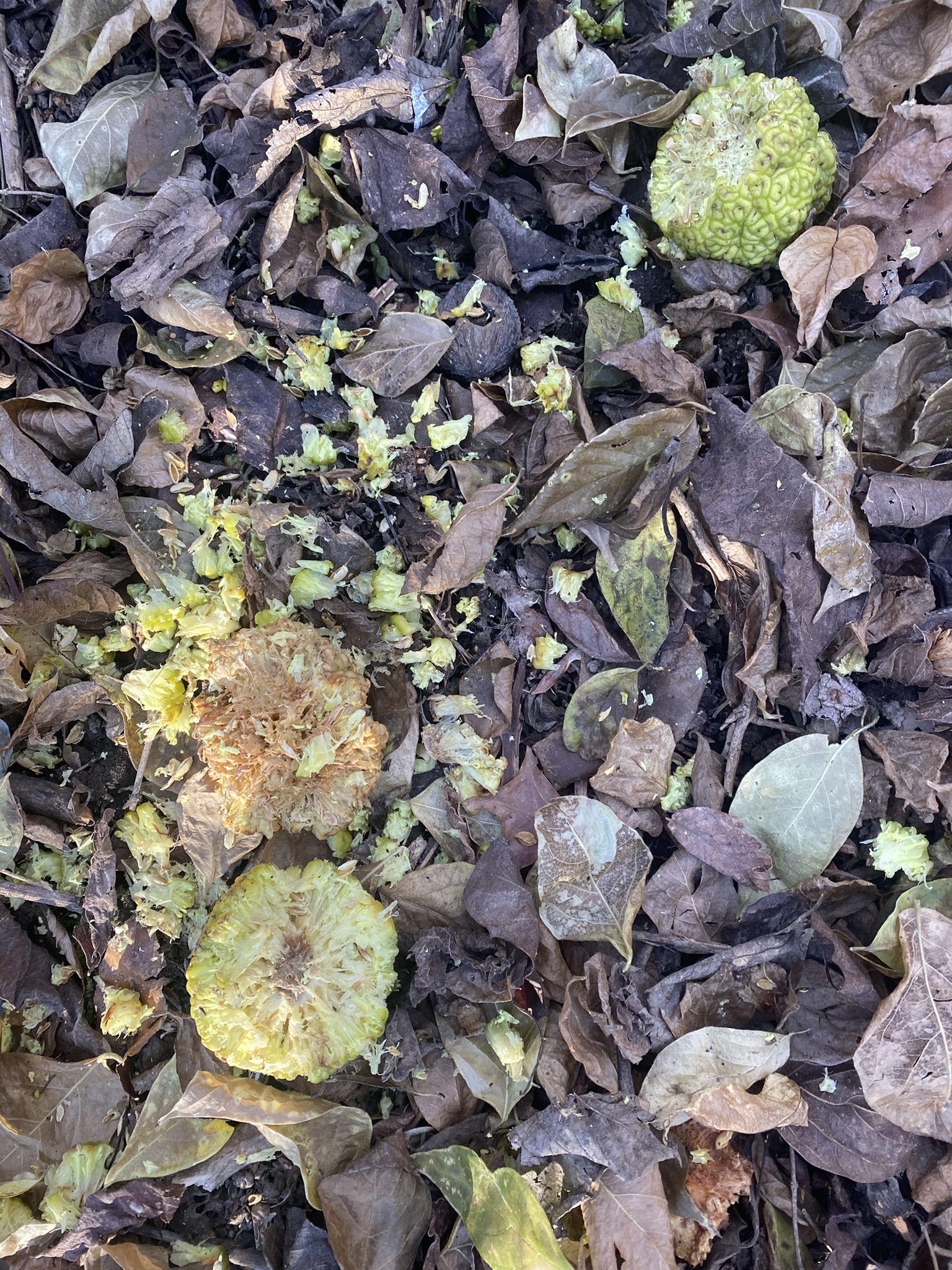A half-eaten osage orange (Maclura pomifera) in December on the forest floor at Flat Fork Creek Park, Fishers, Indiana. The only animal that Wikipedia says eats these is squirrels. It says they are ineffective seed dispersers. Native to Indiana:
