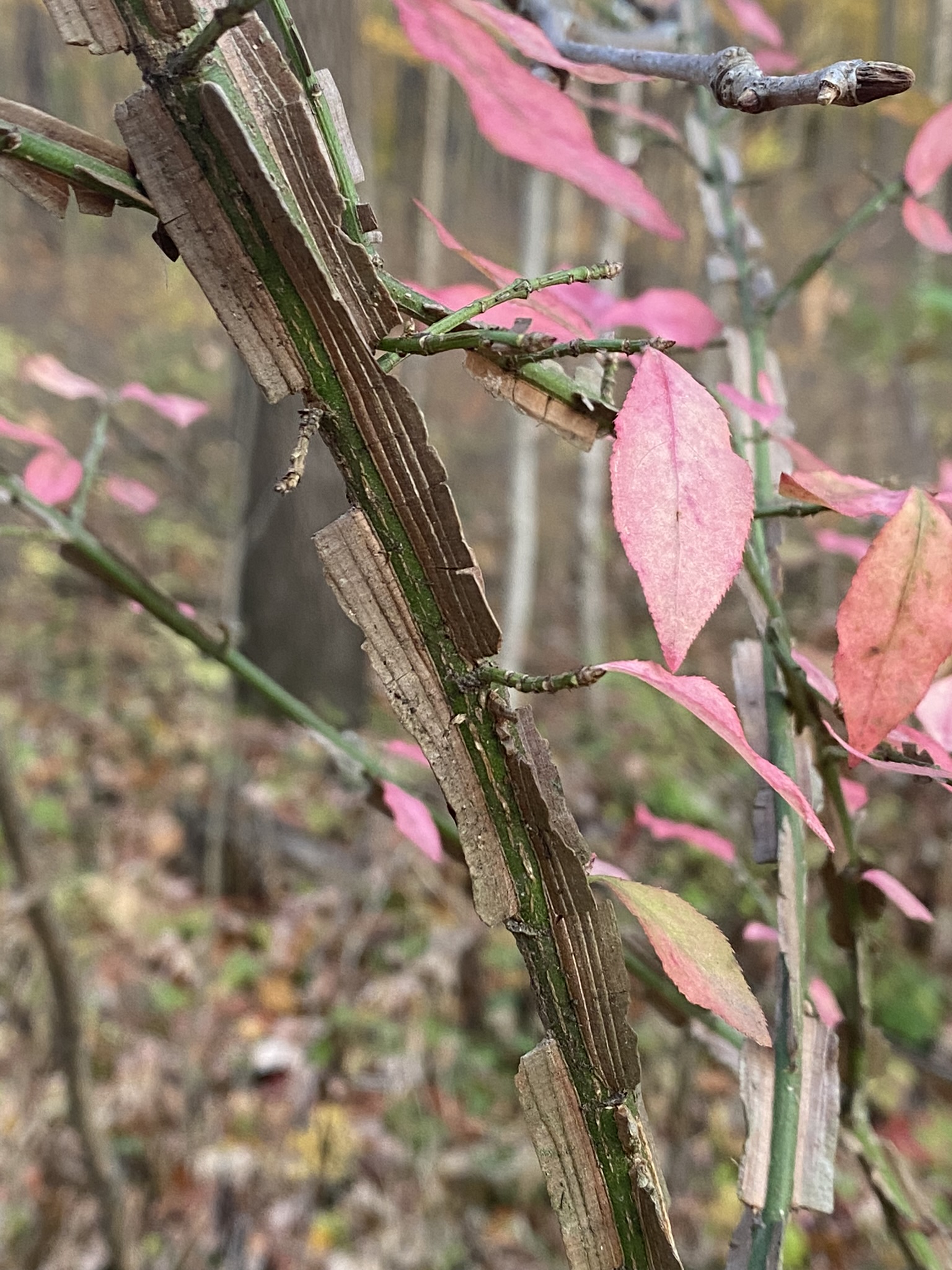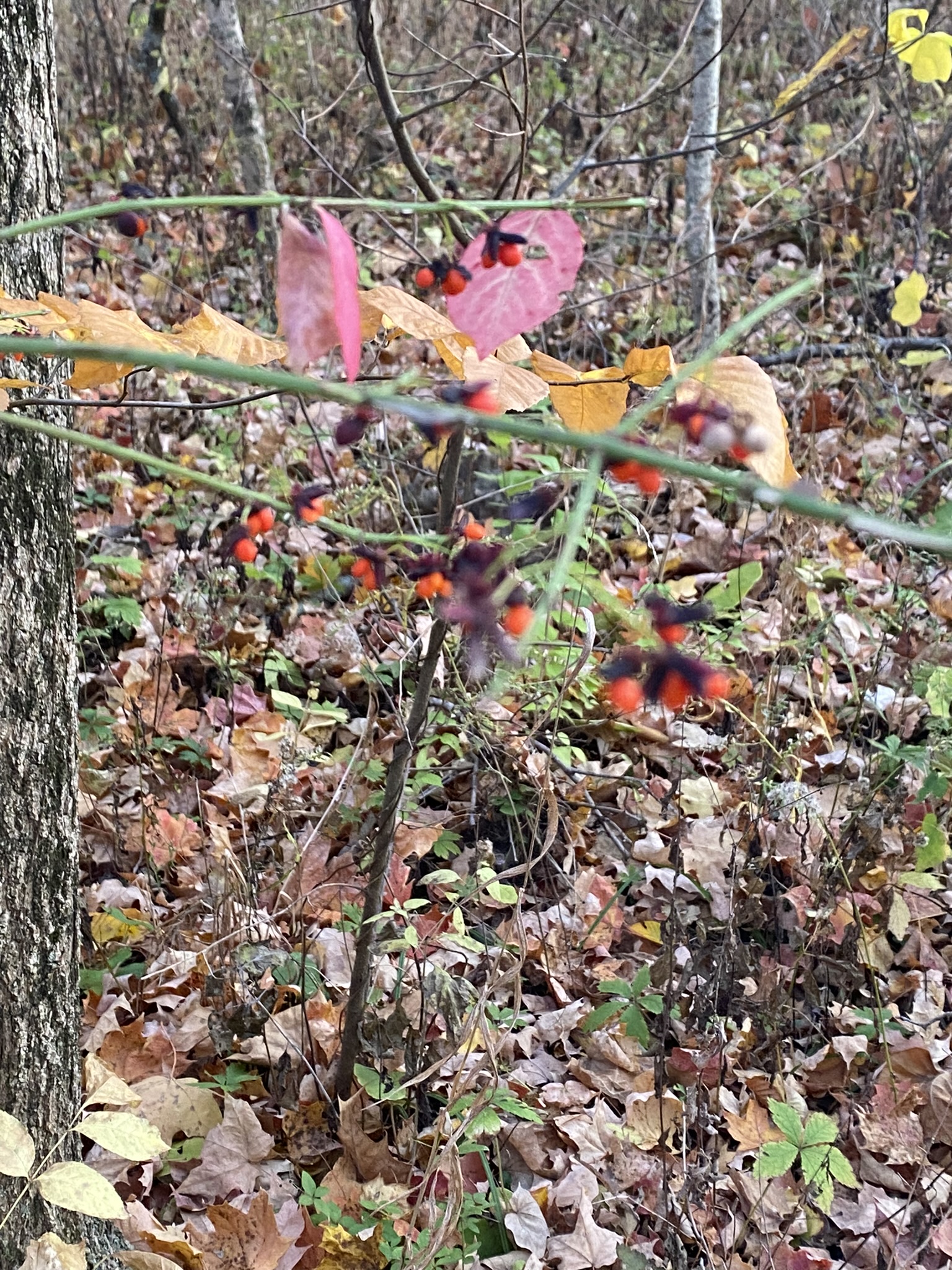This burning bush (Euonymus alatus) in October deep in Ritchey Woods Nature Preserve in Fishers, Indiana, proves that invasive plants in our yards DO spread even though we don’t see it happen. Birds no doubt planted this one. The deep red leaves, the wing-like (hence alatus) formations on the stem, and the red seeds identify it. Sometimes the seeds are yellow or orange: