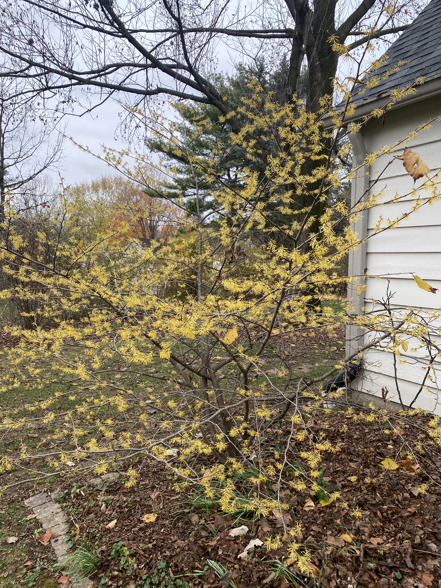 Witch hazel (Hamamelis virginiana) plant in our yard in November in Fishers, Indiana. One of the few shrubs that blooms in the fall. Native to Indiana: