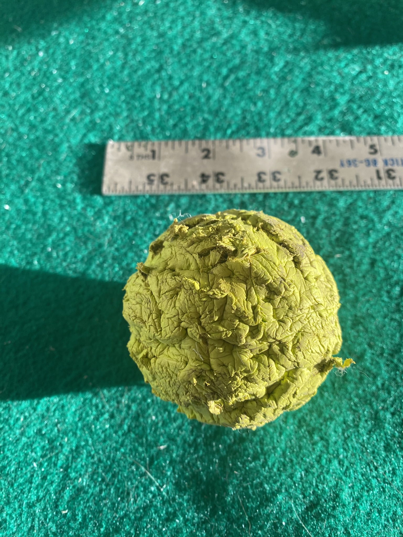A whole osage orange. They’re also called hedge apples, because people sometimes prune them so they grow really thickly and make a hedge. They’re the size of a softball: