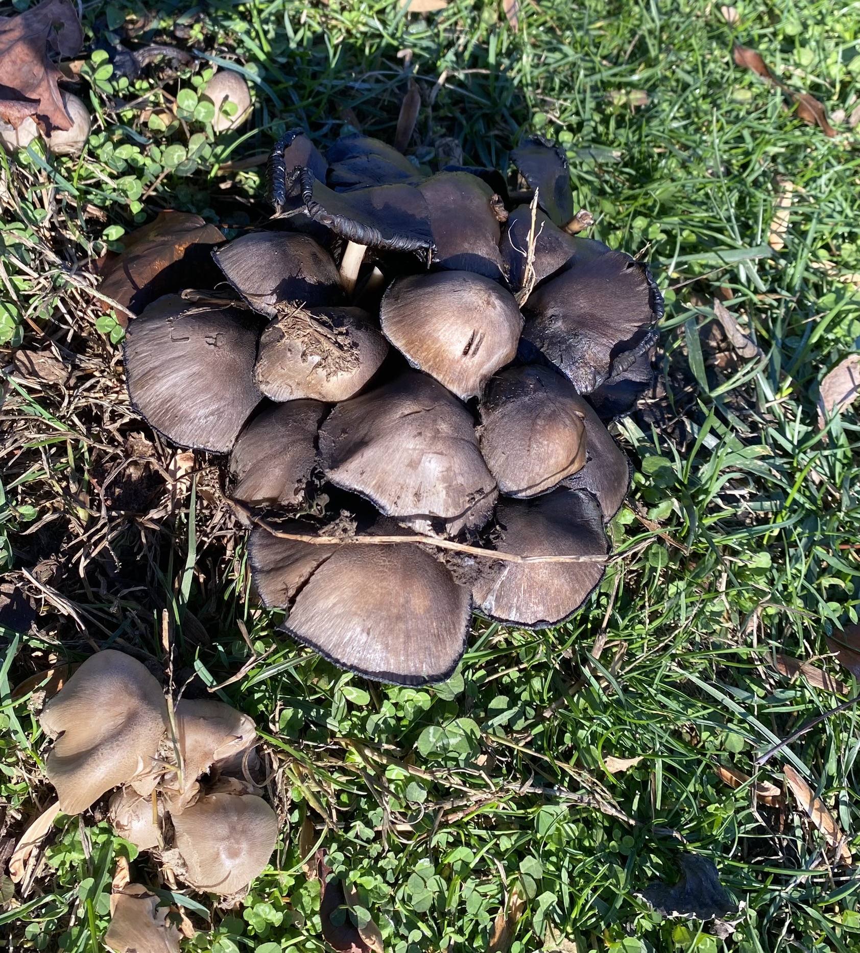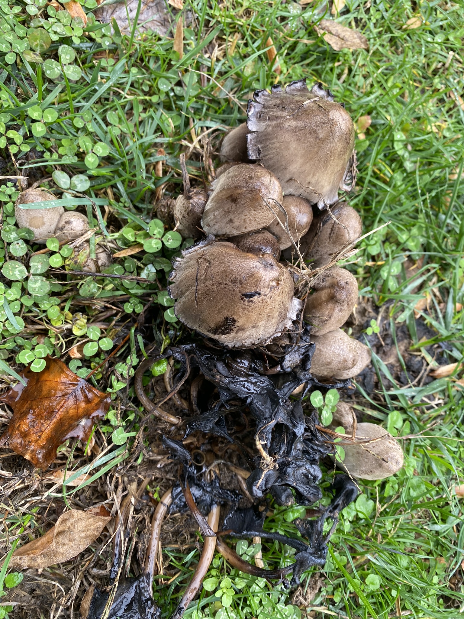 Inky cap (Coprinopsis atramentaria) mushrooms after lots of rain in November in Central Park, Carmel, Indiana. Also known as common ink cap and tippler’s bane (because it’s poisonous when consumed along with alcohol):