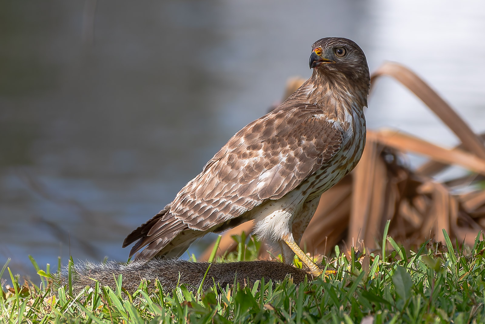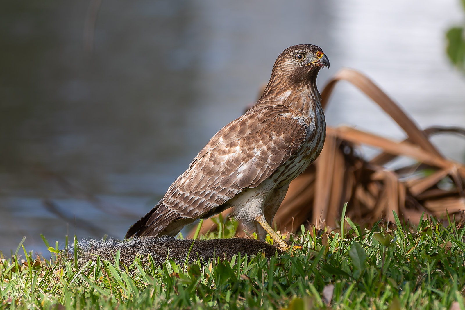 A hawk has been dropping my yard recently. A couple of days ago it got a squirrel which it consumed on my back lawn. Another squirrel, which I took to be its mate, was racing around and close to the hawk while it was perched in the tree observing it’s catch. I took this to be an attempt to distract the bird.
