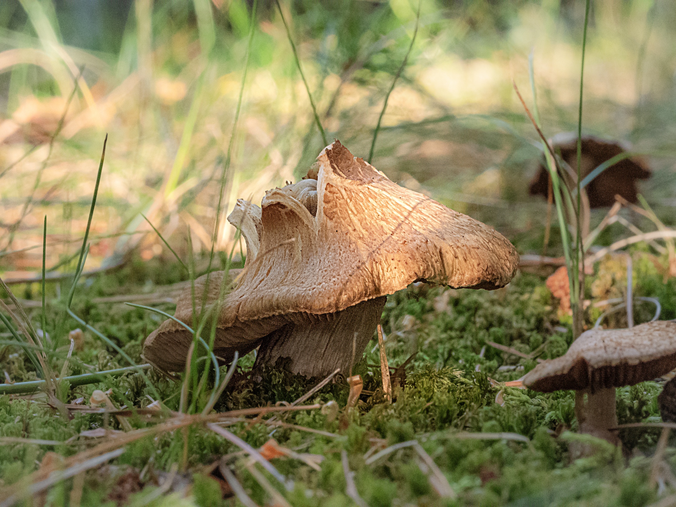 Our first specimen is an Earthy powdercap (Cystoderma amianthinum). The environment in which I found it was in accordance with Wikipedia’s description (“damp mossy grassland, in coniferous forest clearings”), but an image search made me dubious. Perhaps some well informed readers can weigh in. Whatever its true identity, it was plentiful in mossy clearings.