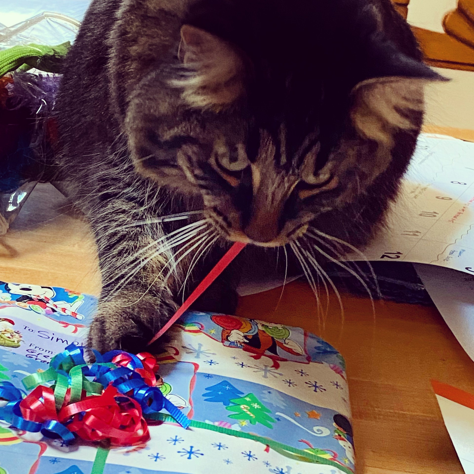 Neville is about to turn six months old and is a pure feline chaos generator. Boundless kitten energy and the classic “who, me?” cattitude. In the photo he sports a bow/ribbon that he pilfered from a holiday package and subsequently had great fun playing with. The photo was taken as evidence of his guilt, not that he was at all repentant…