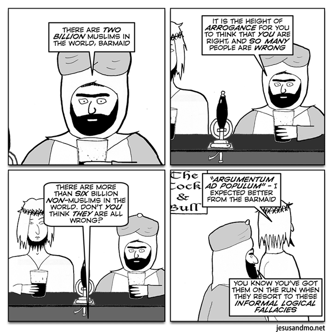 Well, the barmaid is an atheist, so she’d surely lose the argumentum ad populum! On the other hand, I have to laugh when I see people claim that a religion is “true” because it has so many adherents.